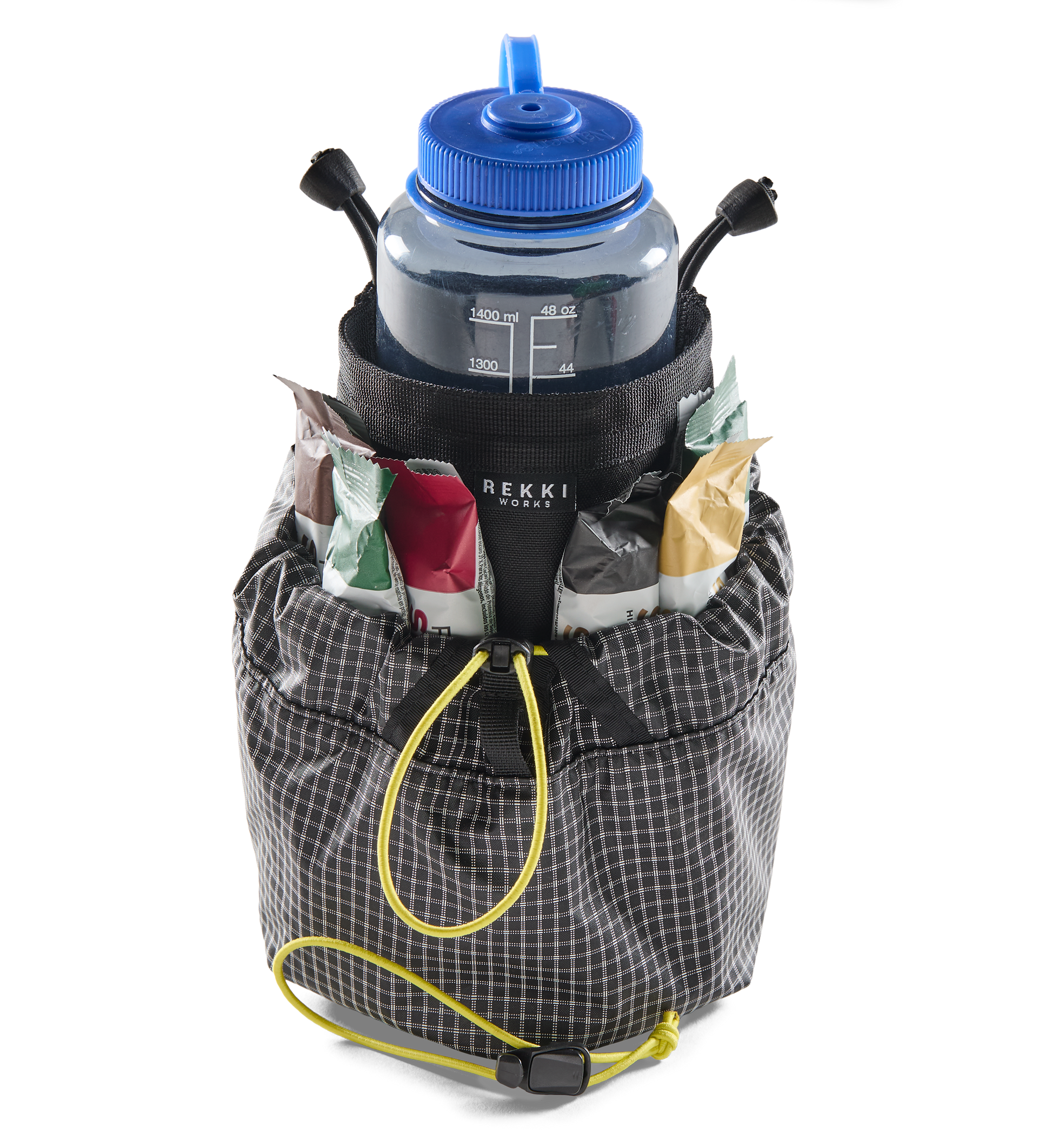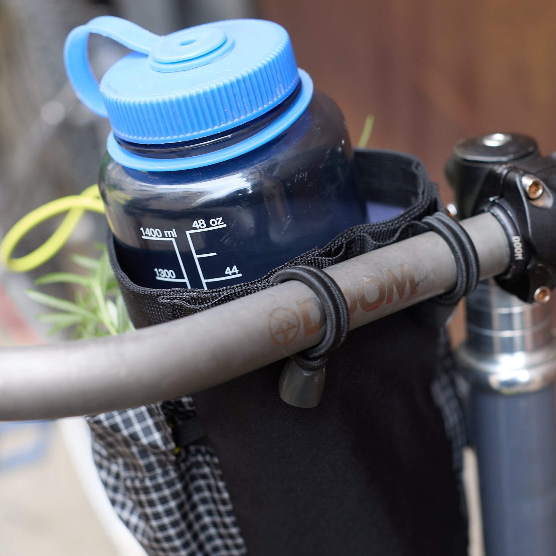 MONSTERMUNCH is an oversized feed bag built for large water bottles (1.5l+), snacks and cold hands. It attaches to the handle bars with the included toggles and stays open.