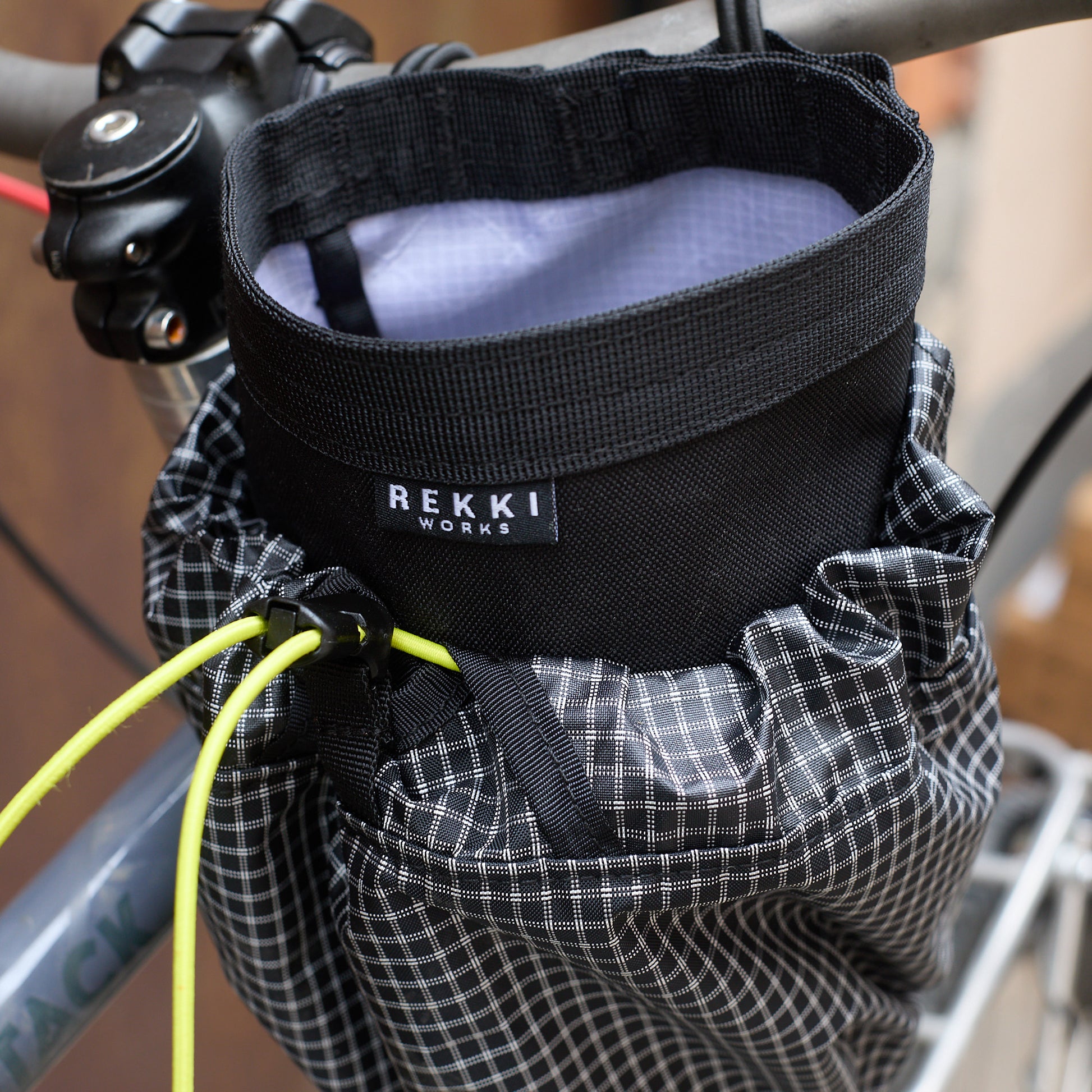 Includes all mounting hardware: 2 bungee toggles (black) for mounting to your handle bars/stem and 1 adjustable bungee toggle (yellow) to stabilise it to your head tube.